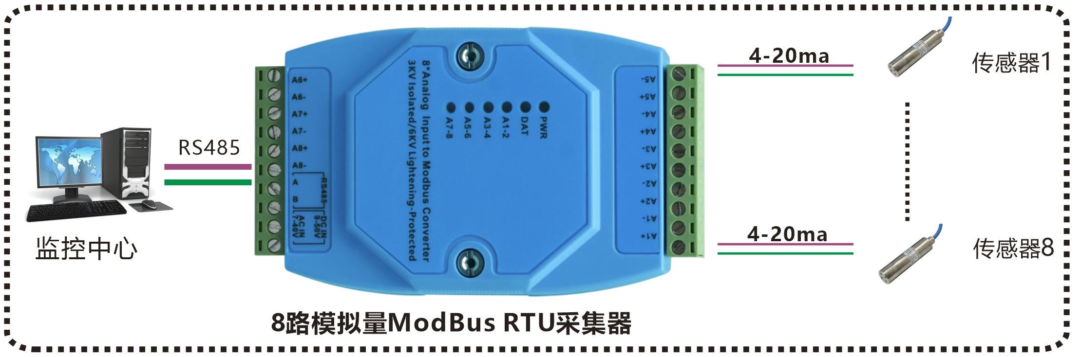 產(chǎn)品功能描述 | 工業(yè)軌式 8路0-20MA/4-20MA/0-10V/0-5V模擬量Modbus RTU采集器 |